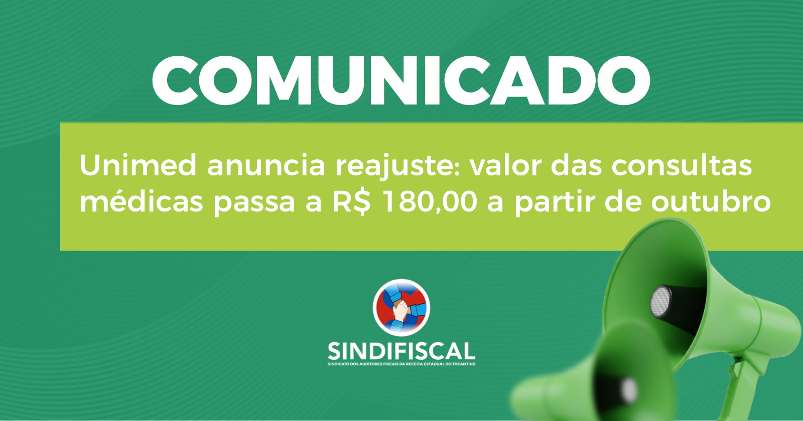 O SINDIFISCAL informa aos seus filiados que, conforme comunicado oficial da Unimed Palmas, a partir do dia 1º de outubro de 2025, o valor das consultas médicas passará a ser de R$ 180,00.
