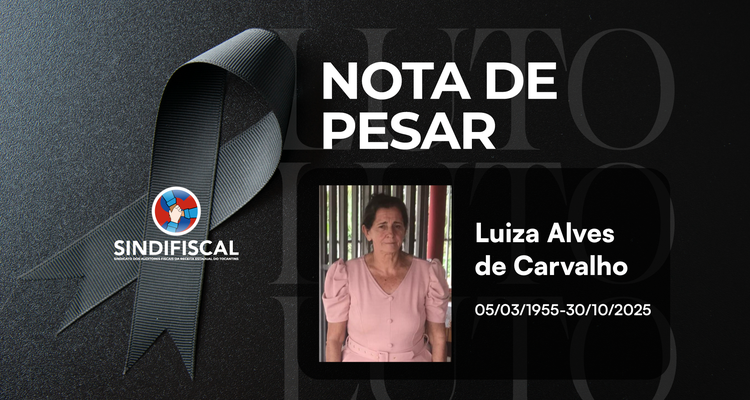 É com profundo pesar que o Sindicato dos Auditores Fiscais da Receita Estadual do Tocantins (SINDIFISCAL) comunica o falecimento de Luiza Alves de Carvalho, nascida em 05 de março de 1955, sogra do auditor fiscal Manoel Alves Gomes, ocorrido nesta quinta-feira, 30 de outubro de 2025.