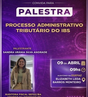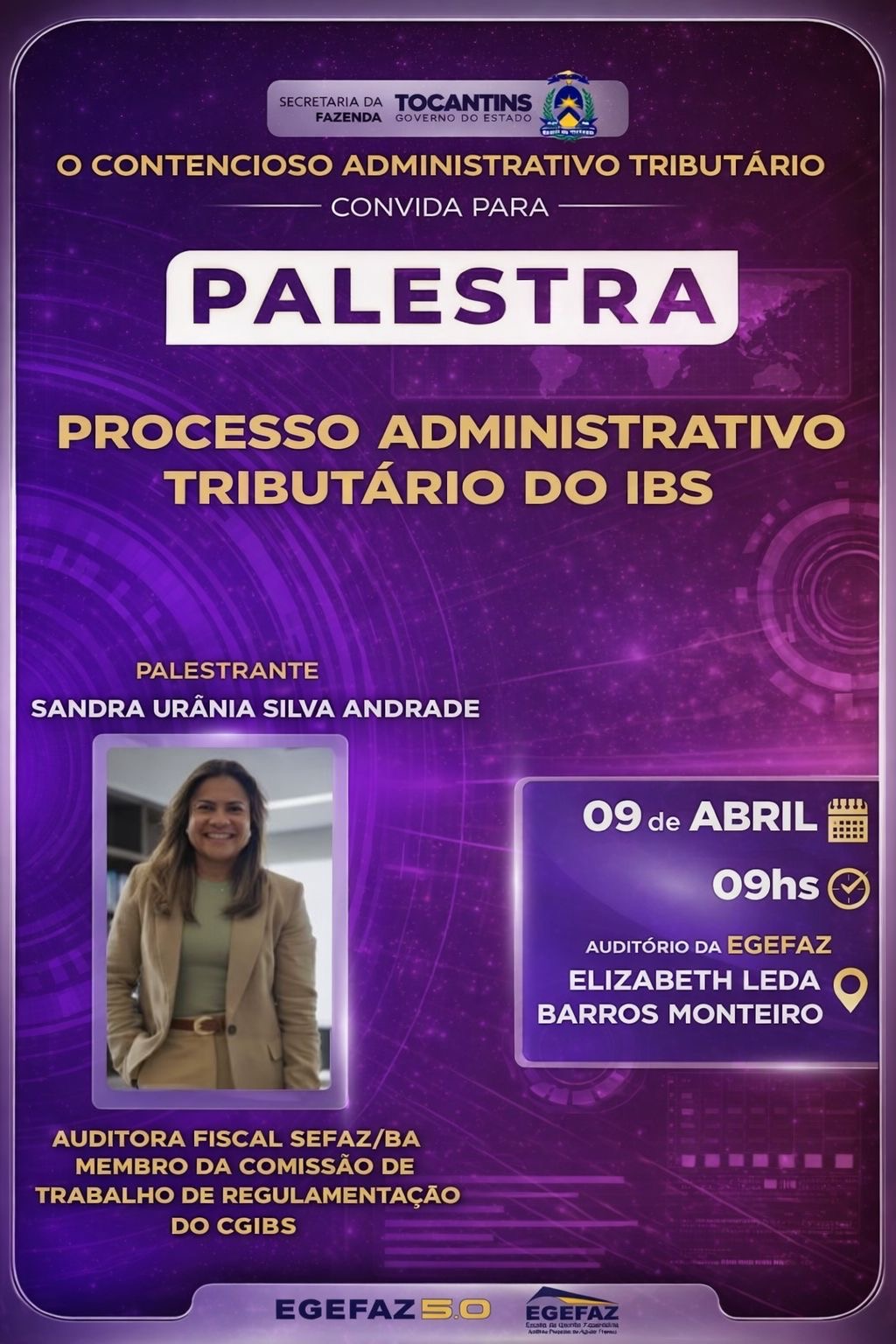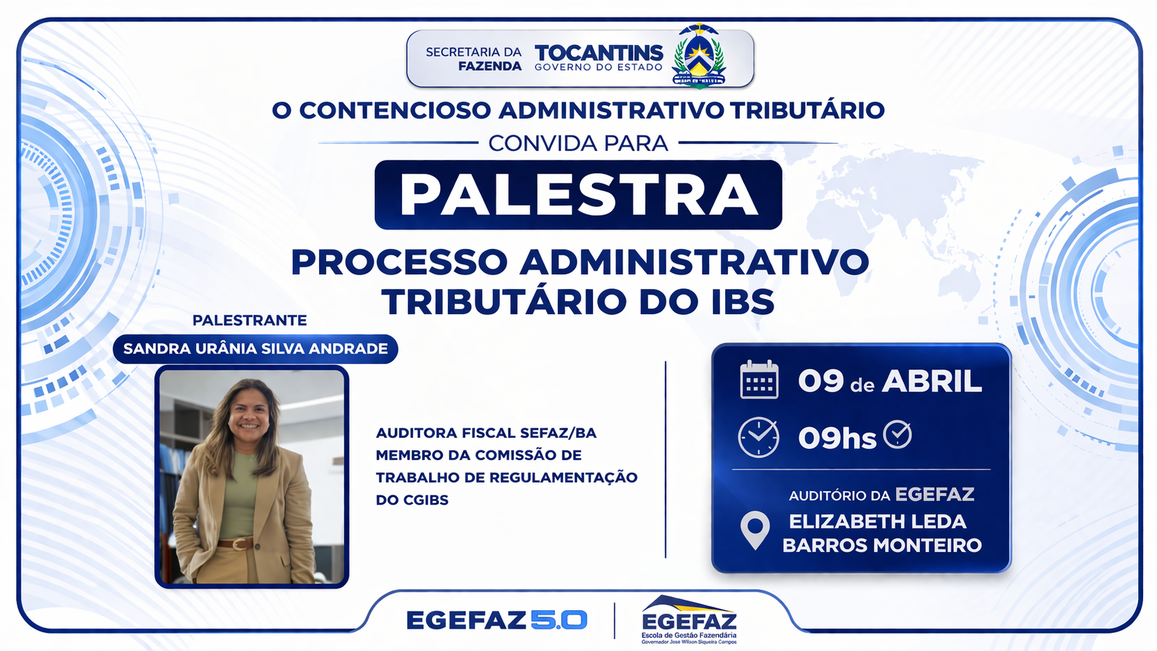A palestra será ministrada pela auditora fiscal Sandra Urânia Silva Andrade, da Secretaria da Fazenda da Bahia, integrante da comissão de trabalho responsável pelas tratativas de regulamentação do Comitê Gestor do Imposto sobre Bens e Serviços (CGIBS). O encontro está marcado para o dia 9 de abril, às 9h, no Auditório da EGEFAZ Elizabeth Leda Barros Monteiro, em Palmas.