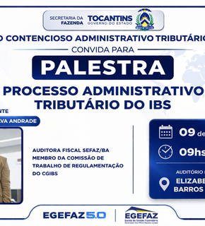 O SINDIFISCAL – Sindicato dos Auditores Fiscais da Receita Estadual do Tocantins divulga aos filiados a realização da palestra “Processo Administrativo Tributário do IBS”, evento promovido pela Secretaria da Fazenda do Tocantins por meio da Escola de Gestão Fazendária (EGEFAZ). A atividade integra a agenda institucional de capacitação voltada ao aprofundamento de temas relacionados à Reforma Tributária e às mudanças que impactam a atuação das administrações tributárias.